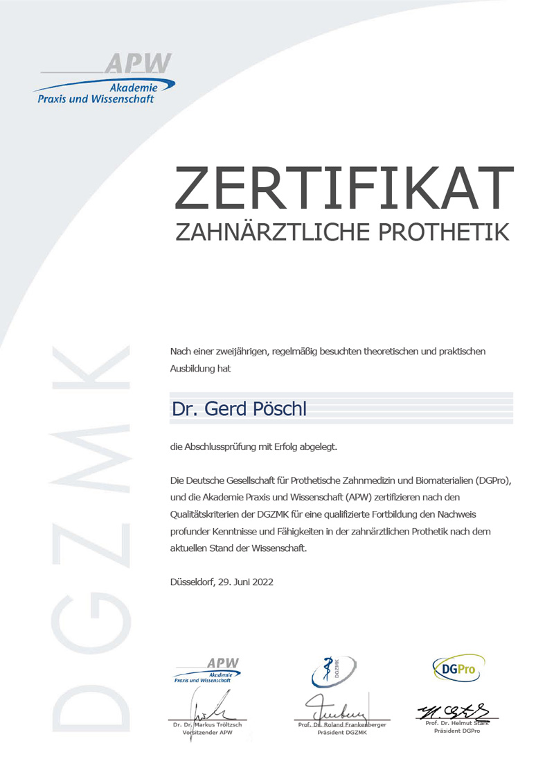 Natürlich tun wir alles dafür, Ihre eigenen Zähne so lange wie möglich gesund zu erhalten. Sollte jedoch nicht mehr genug körpereigene Zahnsubstanz vorhanden sein, lässt sich diese mit Teilkronen oder Kronen ersetzen. Zahnlücken schließen wir mit Hilfe sogenannter Brücken oder Implantaten. Wann immer möglich, versorgen wir unsere Patienten bevorzugt mit solchem festsitzenden Zahnersatz. Wir sind in unserer Praxis darauf spezialisiert, diesen Zahnersatz in Zusammenarbeit mit regionalen zahntechnischen Qualitätslabors aus biologisch hochwertiger Vollkeramik oder anderen innovativen Materialien herzustellen. Und das Ergebnis überzeugt: Ihre Zähne fühlen sich an wie echte Zähne und sehen auch so aus – sie sind handwerklich perfekt gefertigt und werden sorgfältig und schmerzfrei eingesetzt. Unsere Zertifizierung nach dem Qualitätsstandard der DGPro (Deutsche Gesellschaft für Prothetische Zahnmedizin und Biomaterialien) bestätigt die besonderen Fähigkeiten im Bereich der Versorgung unserer Patienten mit Zahnersatz.